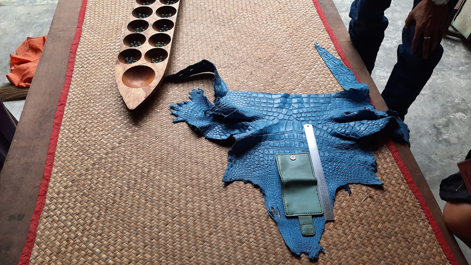 Lors de cette visite, on fait la connaissance de Whirat et Phitsanu. Ces deux messieurs habitent à Nakhon Si Thammarat, pour leur travail, mais sont originaires de Bangkok. Ils sont intrigués par notre présence ici. On discute un peu avec eux. Puis, Phitsanu nous offre deux porte-clés de marionnettes en souvenir de notre rencontre, ce qui est adorable. On va également voir un atelier de fabrication de porte-monnaie et sacs en cuir, et Phitsanu nous offre à nouveau trois porte-câbles en cuir ! Il est incroyable 😄 Je reluque un moment tous ces objets avant de comprendre que l'artisan peut également fabriquer un porte-monnaie ou autre sur mesure. C'est grâce à Whirat, car il se fait justement faire, devant nos yeux, un porte-cartes dans ses goûts avec coutures apparentes. J'explique à l'artisan que nos permis de conduire et carte d'identité français ne rentrent pas dans ces portefeuilles. Il me propose de prendre les mesures de mes papiers et de me confectionner un portefeuille sur mesure, dans de la peau de crocodile teintée bleue. Bon, vu que le dit crocodile est déjà mort et que sa peau traîne sur une étagère, j'ai un peu moins de remords. Tout ça pour un prix de 800 bahts, soit 25€ !!! Ça paraît presque incroyable. Il en a pour au moins 4 à 5h de travail, sans parler du caractère unique de l'objet, je n'arrive pas à y croire. Lorsqu'on veut lui laisser un acompte, il refuse et dit qu'on paiera tout le lendemain si le portefeuille nous plaît 👍 J'ai hâte de voir le résultat le lendemain, rdv pris à 10h...